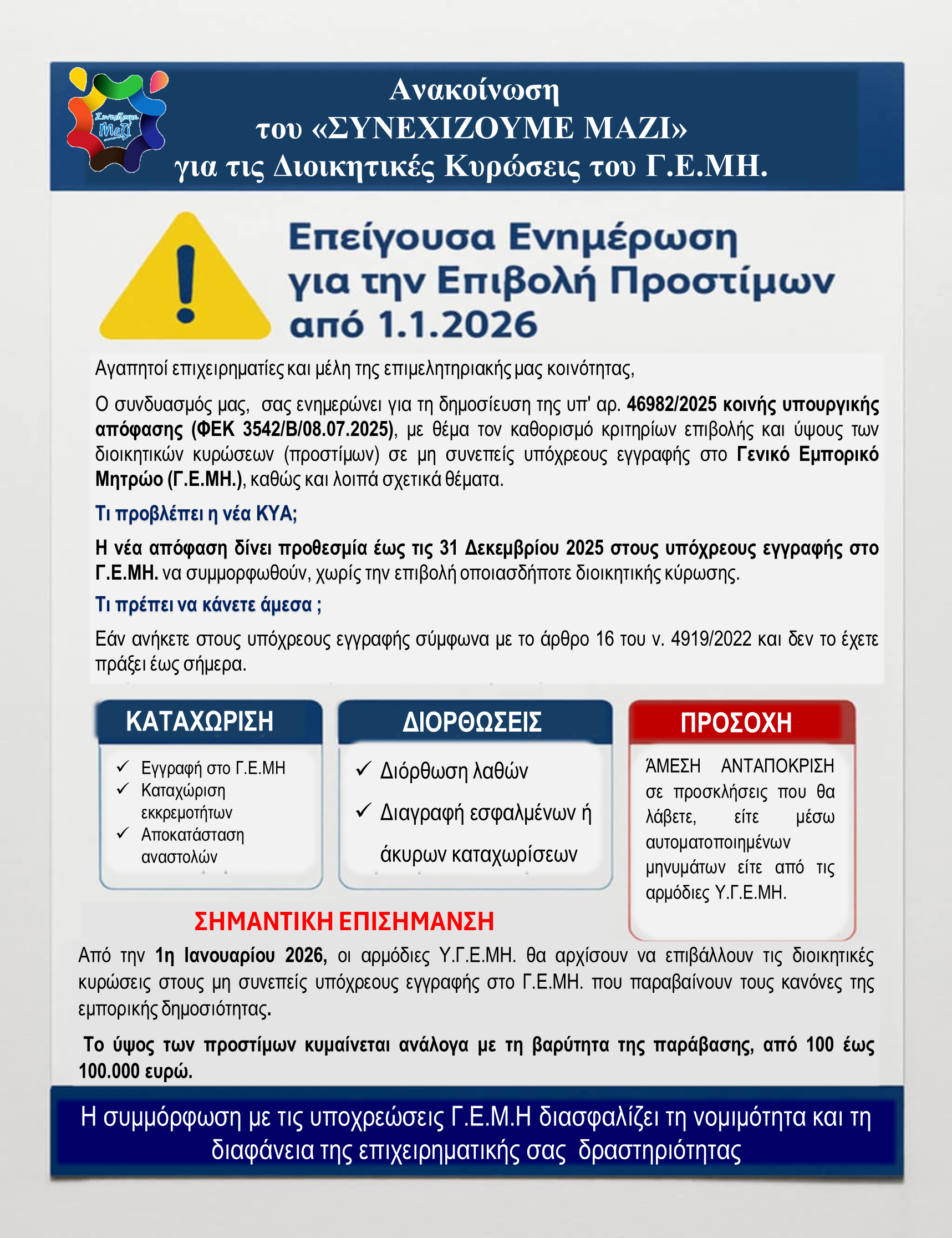 Επιπλέον, θα θέλαμε να σας ενημερώσουμε ότι χθες ο συνδυασμός μας πραγματοποίησε τοποθέτηση με συγκεκριμένες προτάσεις προς την πολιτεία, με στόχο το Γ.Ε.ΜΗ. να μην αποτελέσει απλώς ένα επιπλέον γραφειοκρατικό και οικονομικό βάρος για τις επιχειρήσεις. Η θέση μας είναι ότι το Γ.Ε.ΜΗ. πρέπει να λειτουργεί ως εργαλείο διευκόνσης και διαφάνειας, και όχι ως πηγή προστίμων και πρόσθετων επιβαρύνσεων.