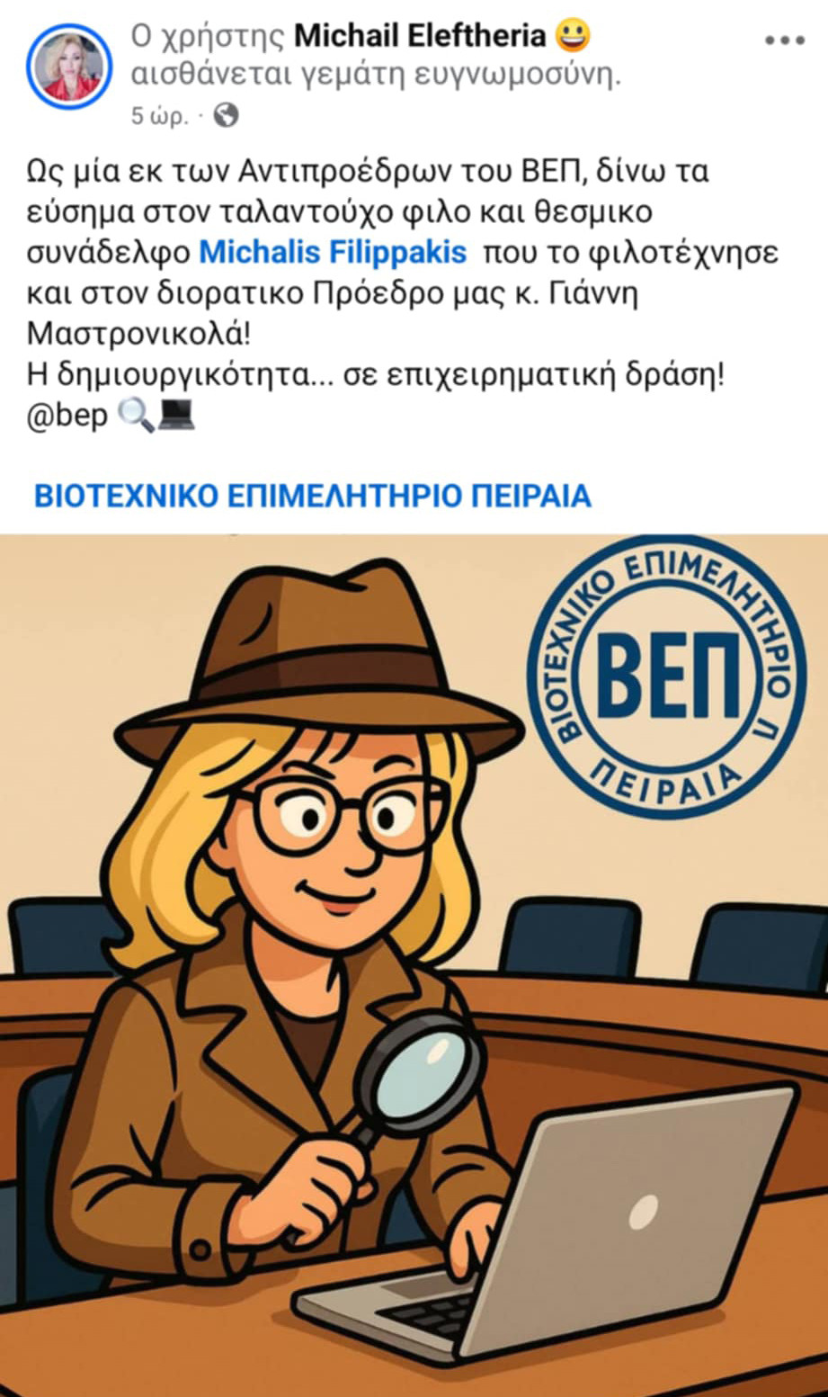 Είναι αδιανόητο και ανεπίτρεπτο, εν μέσω αυτής της ιστορικής επετείου, να παρατηρείται η χρήση ενός παραποιημένου ή μη επίσημου λογότυπου του ΒΕΠ σε δημόσια επικοινωνία από θεσμικό πρόσωπο, και συγκεκριμένα στο avatar της φερόμενης Β’ Αντιπροέδρου του Επιμελητηρίου. Η εικόνα αυτή, που συνδυάζει ένα προσωπικό εικαστικό με ένα παραποιημένο λογότυπο του ΒΕΠ, συνιστά κατάφωρη παραβίαση κάθε έννοιας θεσμικής δεοντολογίας και σεβασμού προς τον οργανισμό που εκπροσωπεί.